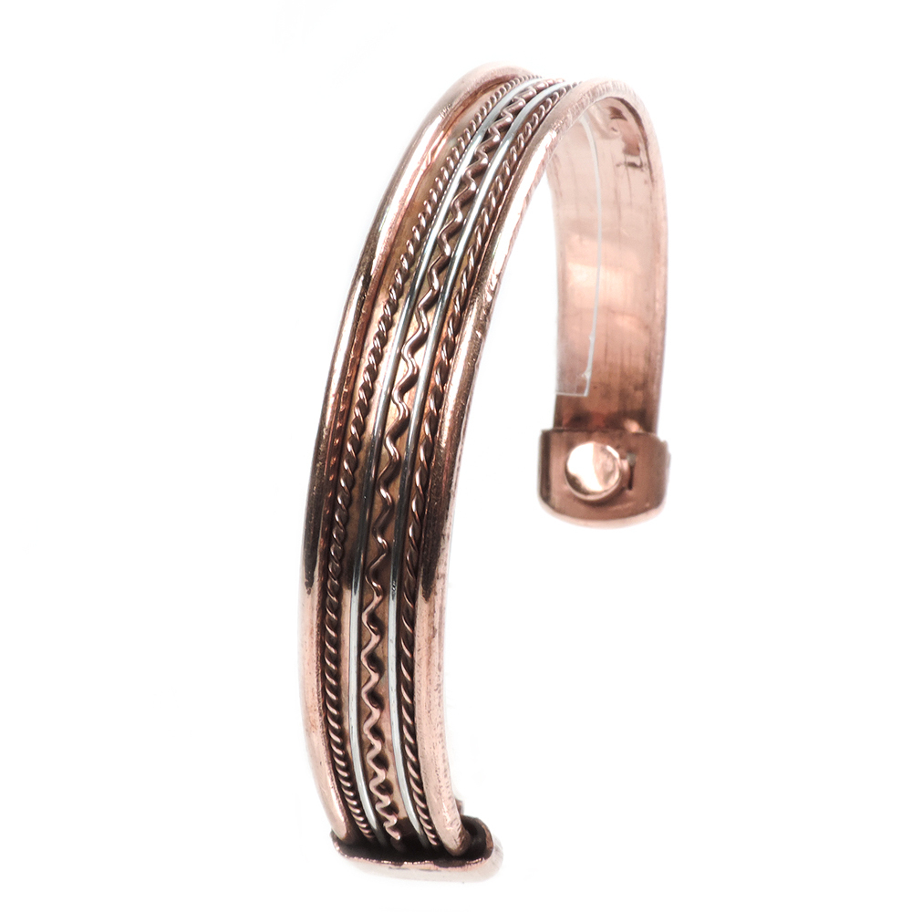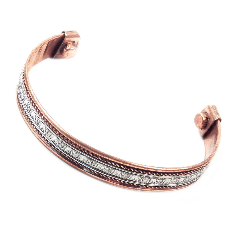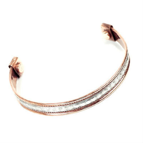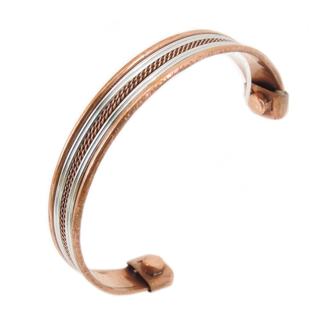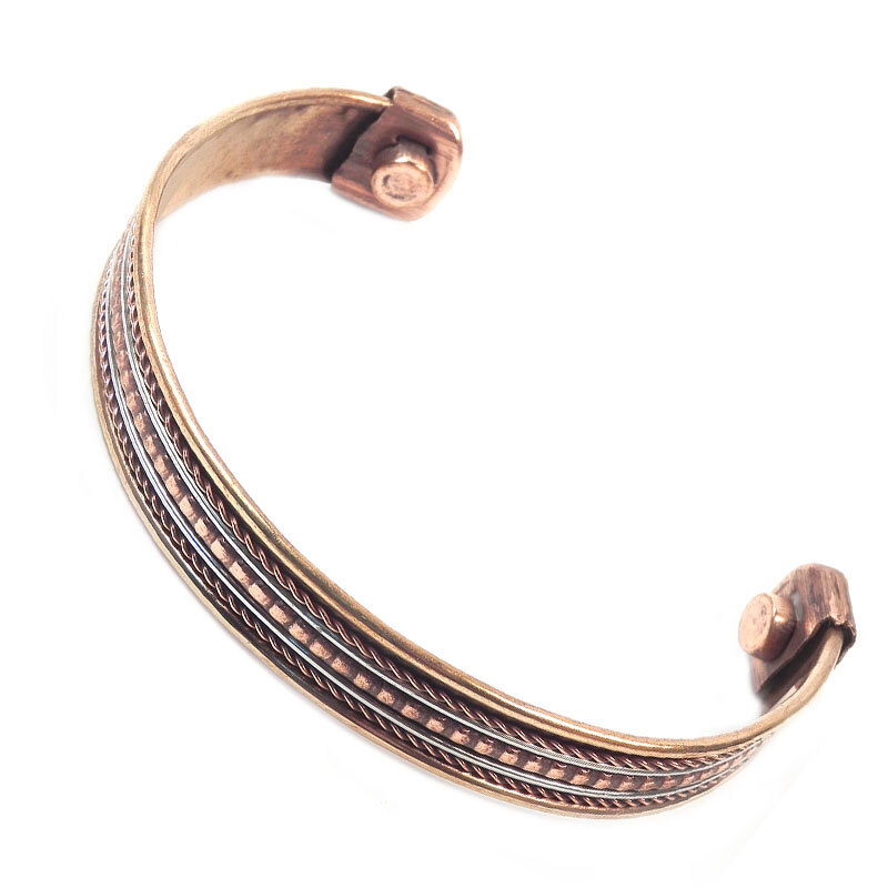 Организму требуется этот важный элемент. Человек получает медь из продуктов и воды. Нехватка этого элемента приводит к серьезным последствиям. В одном литре крови содержится до 25 мкм меди. Суточная норма на килограмм веса составляет 0,05 мг вещества. Иногда в крови его содержится мало и нужно восполнять эту нехватку. Одни предпочитают лекарства, когда появляется необходимость в восполнении меди. Не всем нравится постоянно пить таблетки, которые к тому же могут быть дорогими. К счастью, медь также проникает в организм через кожу и впитывается без проблем. Поэтому люди выбирают ношение медных украшений. Помочь могут и медные браслеты. Во время ношения наш организм начинает восстанавливать дефицит этого важного элемента. Постепенно на коже появляются зеленоватые следы-это является показателем работы браслета. Рекомендовано носить медные украшения при гипертонии и гипотонии. Считается, что помогает медный браслет от давления, болевого синдрома, артрита и плохого самочувствия.