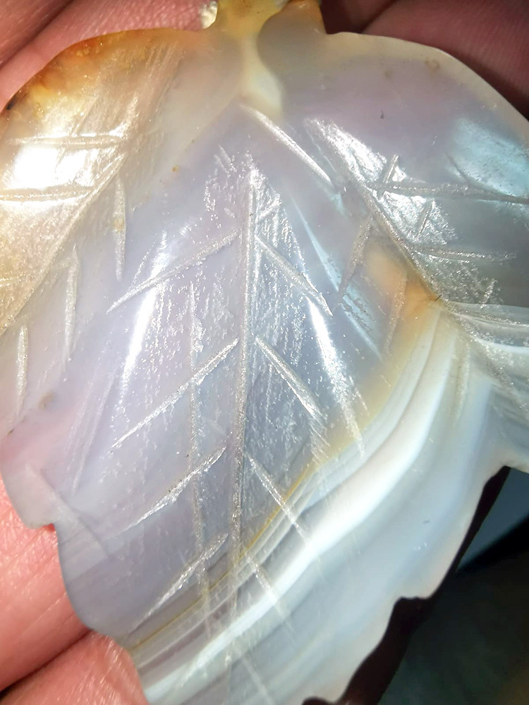 2, Жемчужно-серый лист, с молочным узором и бледно-желтым краем.