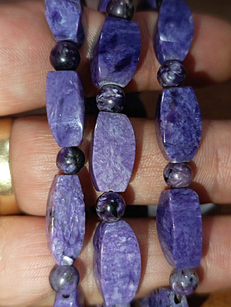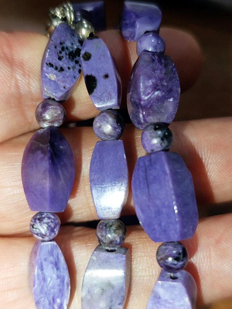 Как лекарь чароит следит за общим состоянием организма, более всего обращает внимание на нервную систему, успокаивая и снимая стрессы, активизируя мозг, память. Он очень полезен при заболеваниях позвоночника, грыжах позвоночника, прострелах, люмбаго, исправляет искривления позвоночника, помогает при переломах костей.