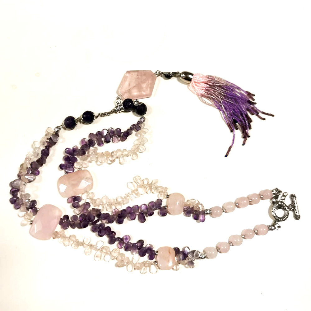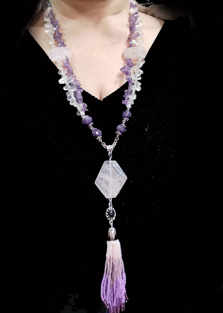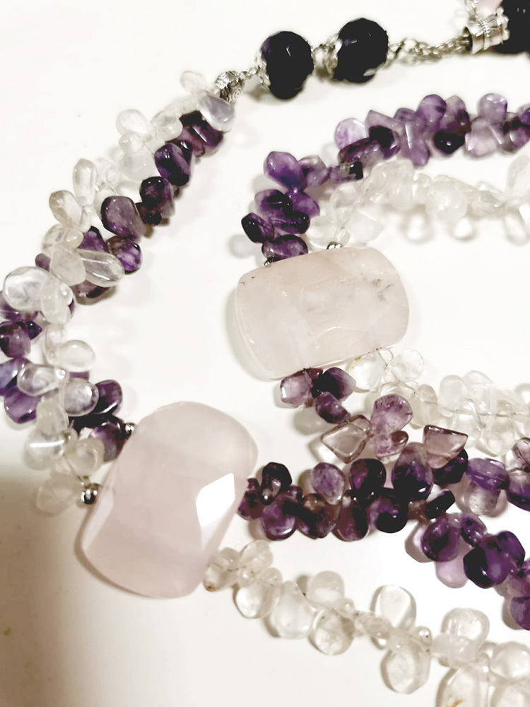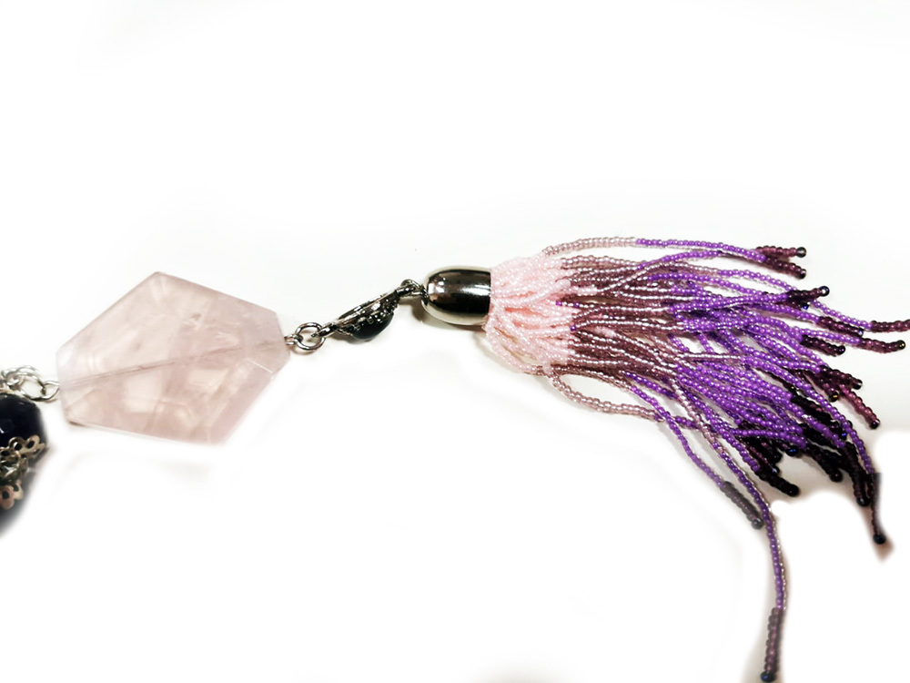 Бусины нанизаны на тросик-ланку. Ажурная фурнитура.