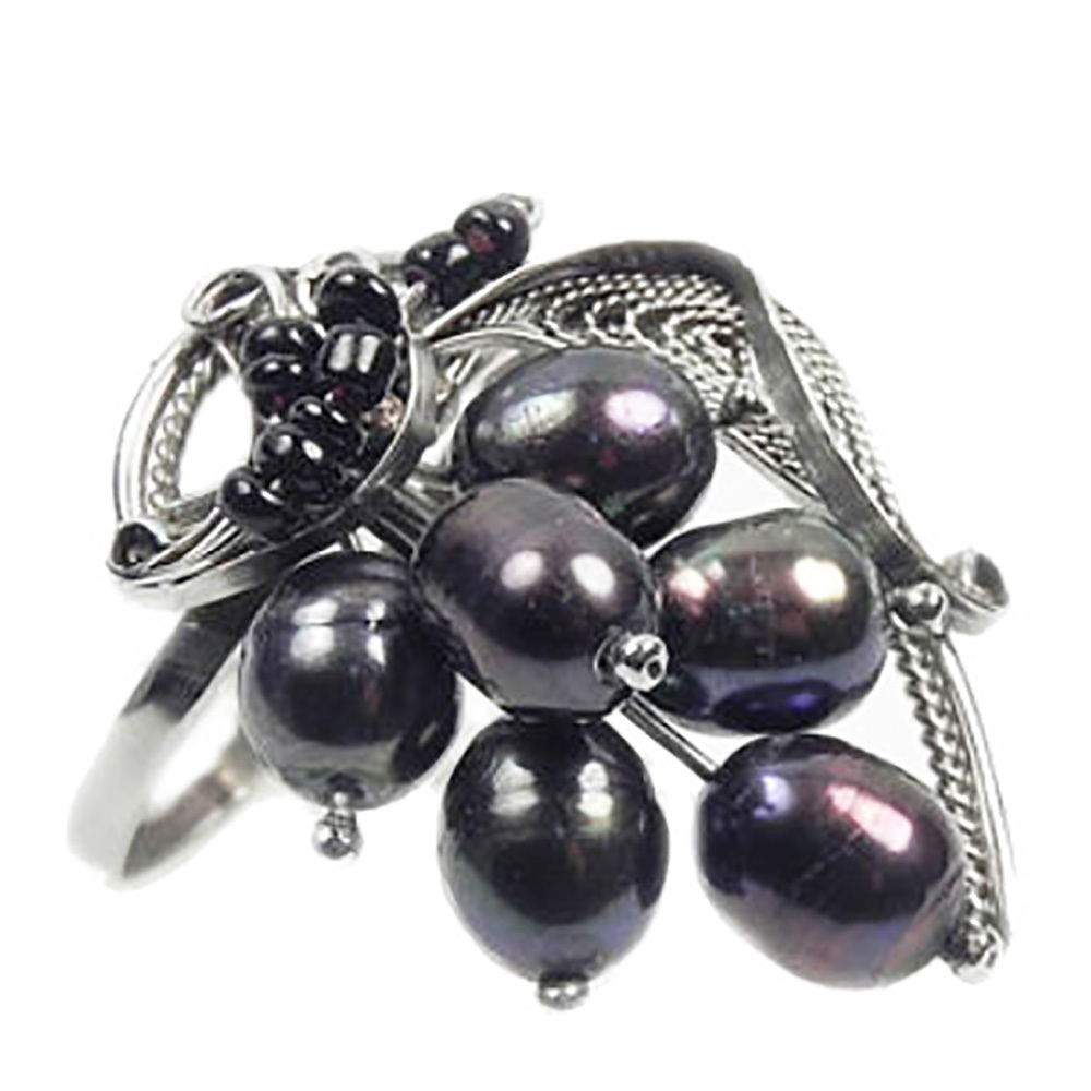 Ажурное кольцо в технике "русская скань" со вставками темного жемчуга.
