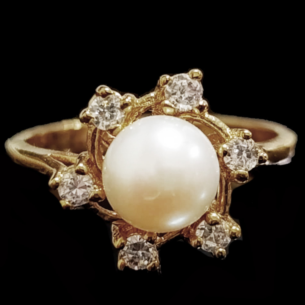 Красивое эффектное кольцо со вставками жемчуга мабэ и фианитов.