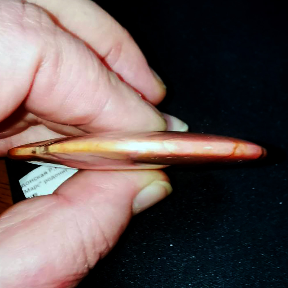 Минерал непрозрачный, гладко отполированный. Сквозное сверление.
