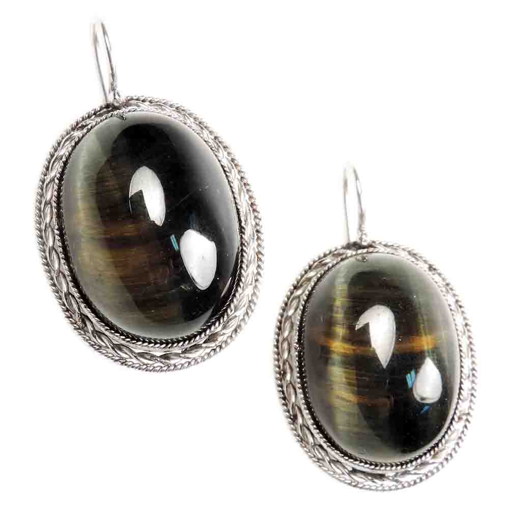 Прекрасные серьги со вставками натурального глазкового кварца.