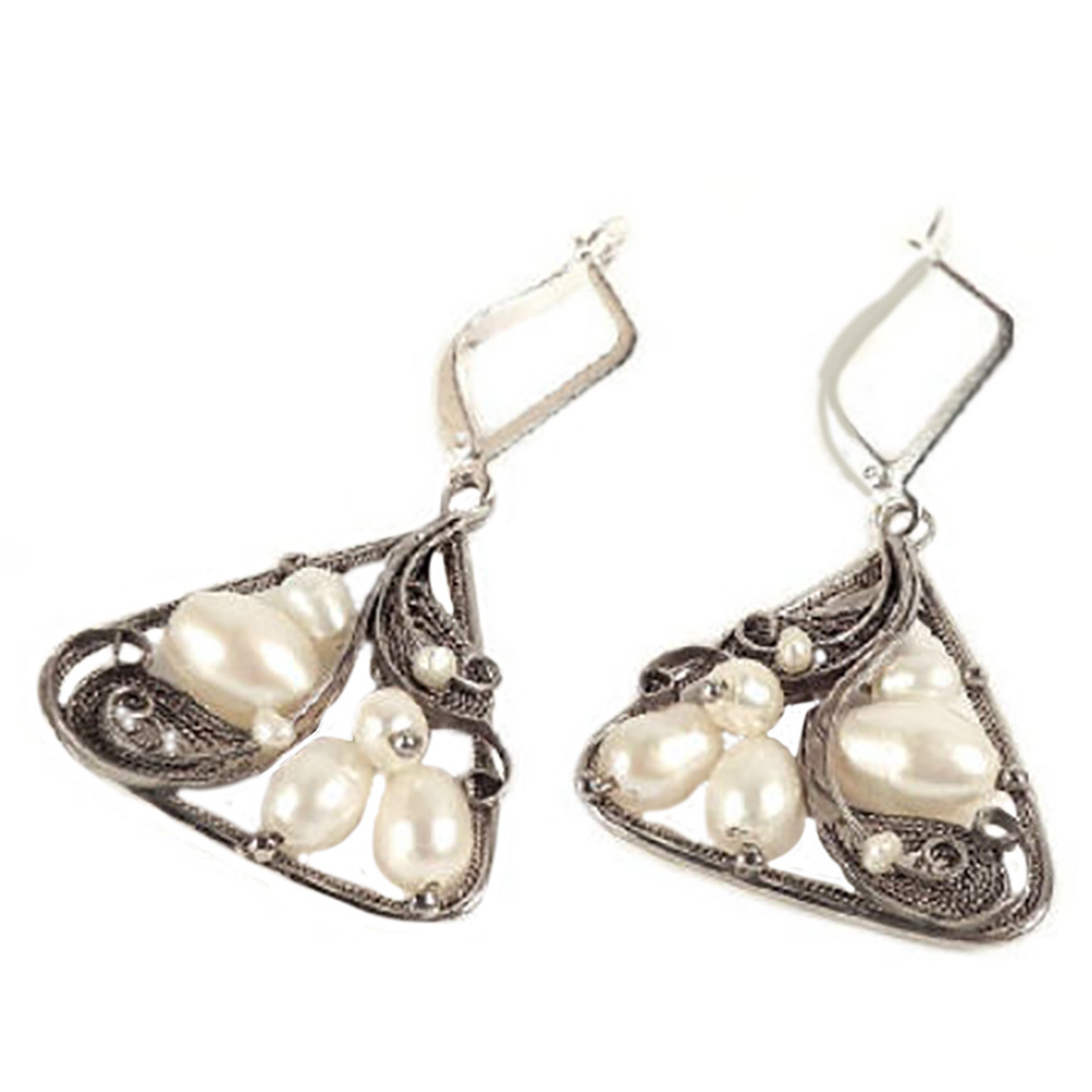 Оригинальные ажурные серьги со вставками культивированного жемчуга.